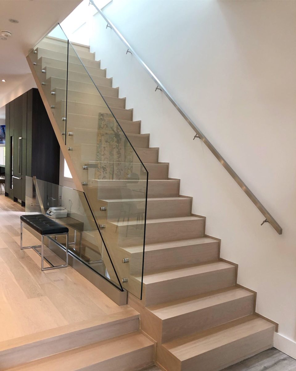 Glass railings side mounted on stainless steel stand-offs on the stairs and surface mounted in a base shoe on the main floor keeping the glass stacked for the cleanest look. Square handrail side mounted on the wall.
